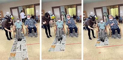 [新聞で競争ゲーム] 足を使って新聞を手繰り寄せていきます。健脚の見せどころです!